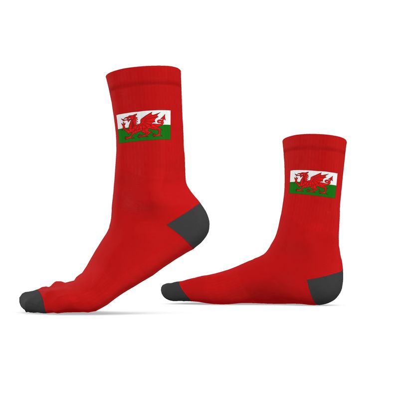 Celebrate the fierce spirit of the Y Ddraig Goch with these handmade red Crew socks featuring the iconic national symbol.